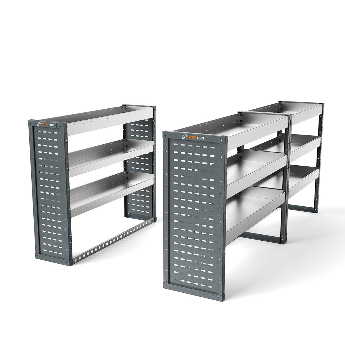 Tough, no-nonsense galvanised steel shelving built for graft. Height adjustable in 50mm increments. Perfect for power tools, inventory, and kit. Optional anti-slip mats and metal dividers keep your gear steady on the move.